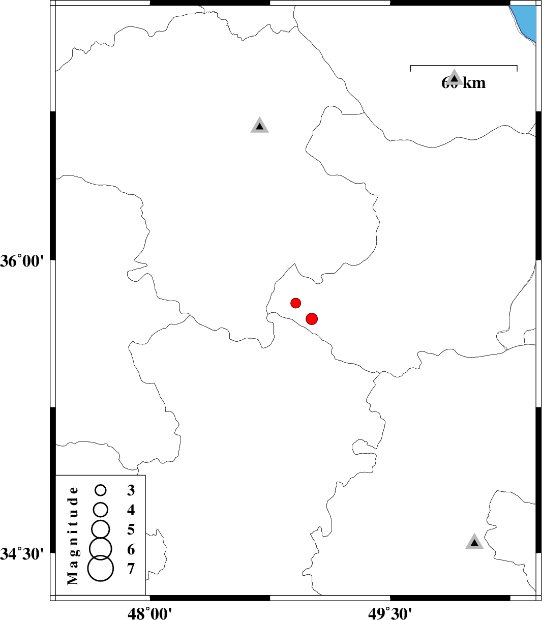 | 2007/10/15 | 03:54:21.2 | 07:24:21.2 | 35.78 | 48.91 | 15 | ML:2.8 | 45 km North-West of Razan, Hamedan Province | ||