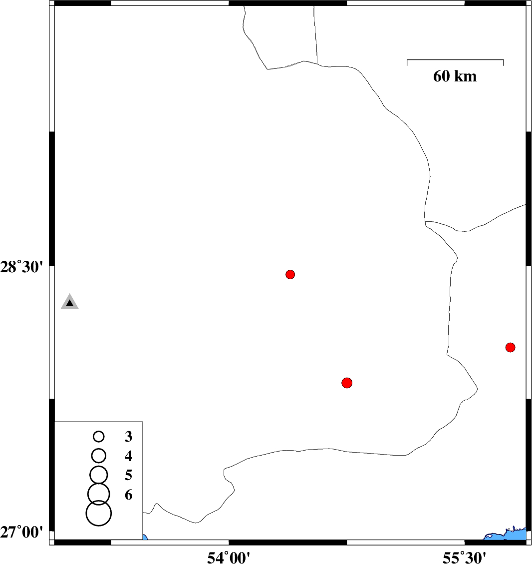 | 2007/10/17 | 11:59:02.4 | 15:29:02.4 | 27.84 | 54.75 | 18 | ML:2.9 | 43 km North-East of Lar, Fars Province | ||