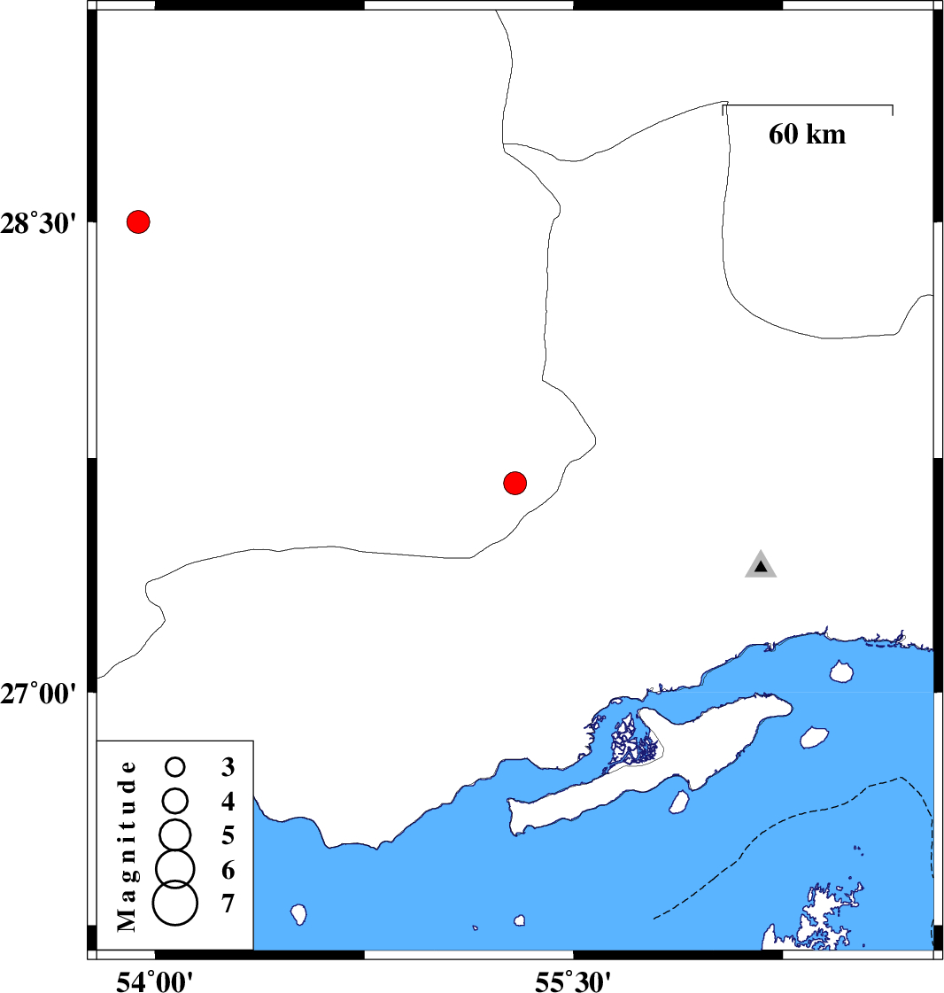 | 2007/11/11 | 23:23:51.6 | 02:53:51.6 | 28.5 | 53.94 | 14 | ML:3.7 | 37 km East of Jahrom, Fars Province |