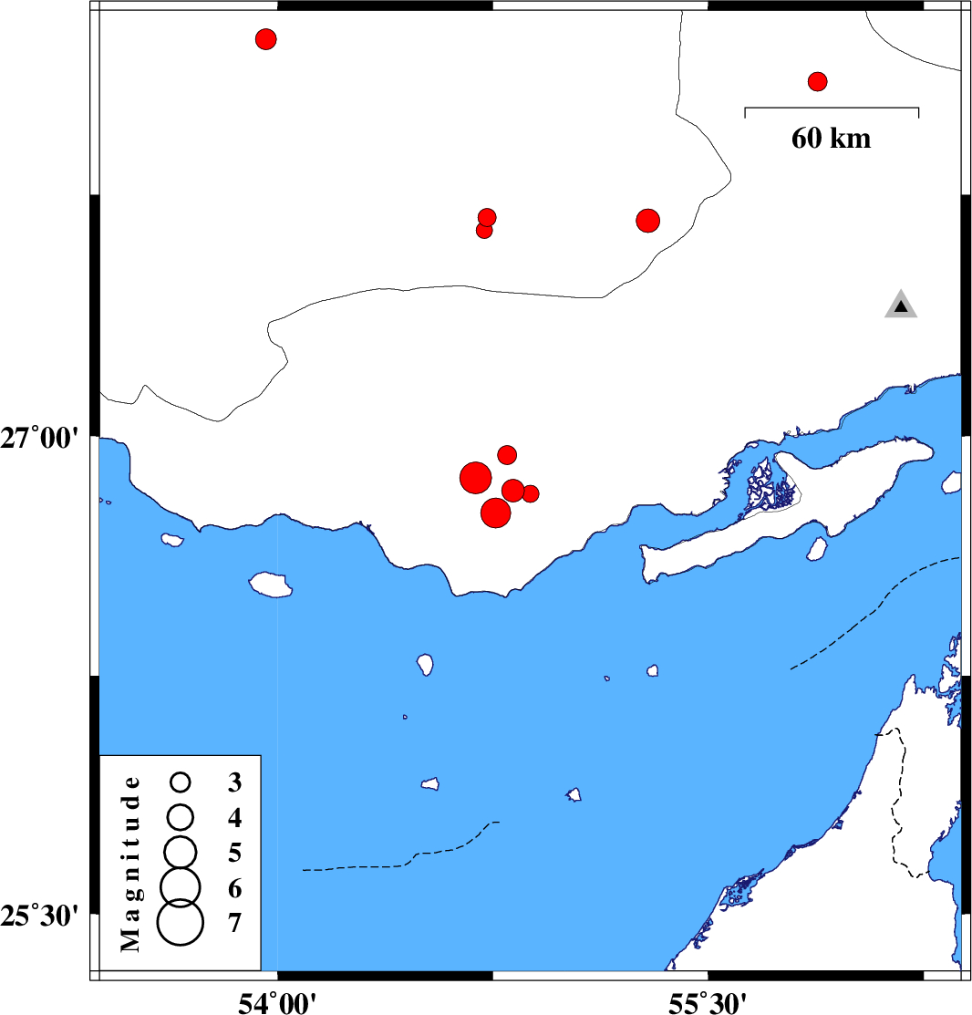 2007/11/22 05:45:46.8 09:15:46.8 26.8254.8818 ML:2.7 32 km North of Bandar-e lengeh, Hormozgan Province