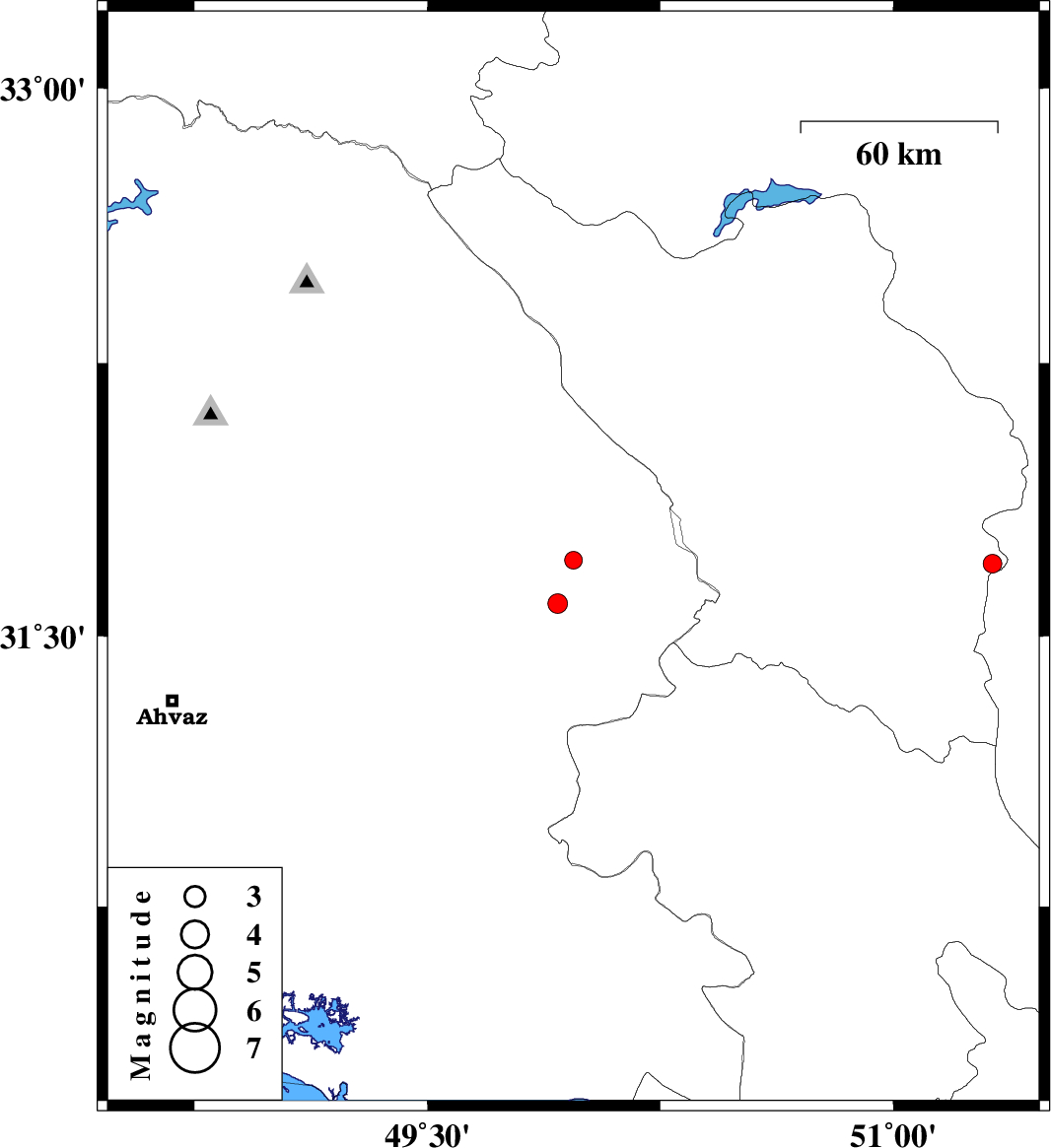 | 2007/11/30 | 19:11:51.0 | 22:41:51.0 | 31.59 | 49.92 | 45 | ML:2.8 | 8 km Bagh Malek, Khoozestan Province | ||