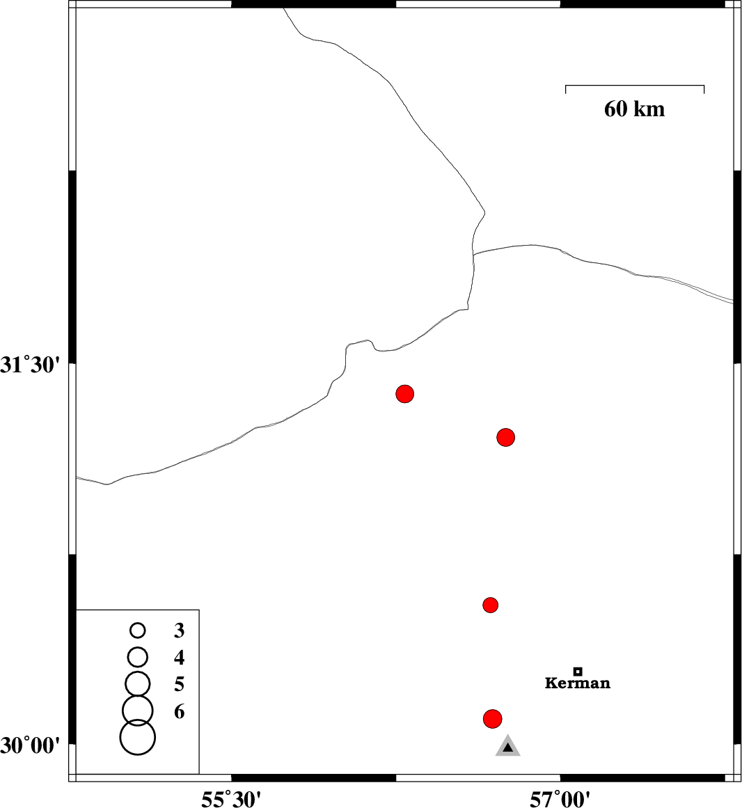 | 2007/12/01 | 16:55:22.5 | 20:25:22.5 | 30.1 | 56.69 | 14 | ML:3.8 | 22 km North-East of Bardsir, Kerman Province | ||