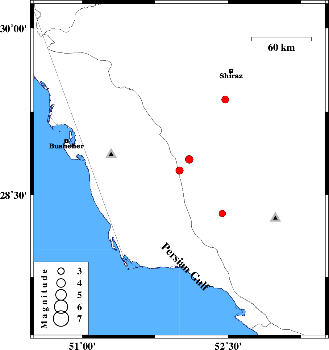 | 2007/11/15 | 02:37:41.1 | 06:07:41.1 | 29.36 | 52.47 | 46 | ML:3.4 | 29 km South of Shiraz, Fars Province |