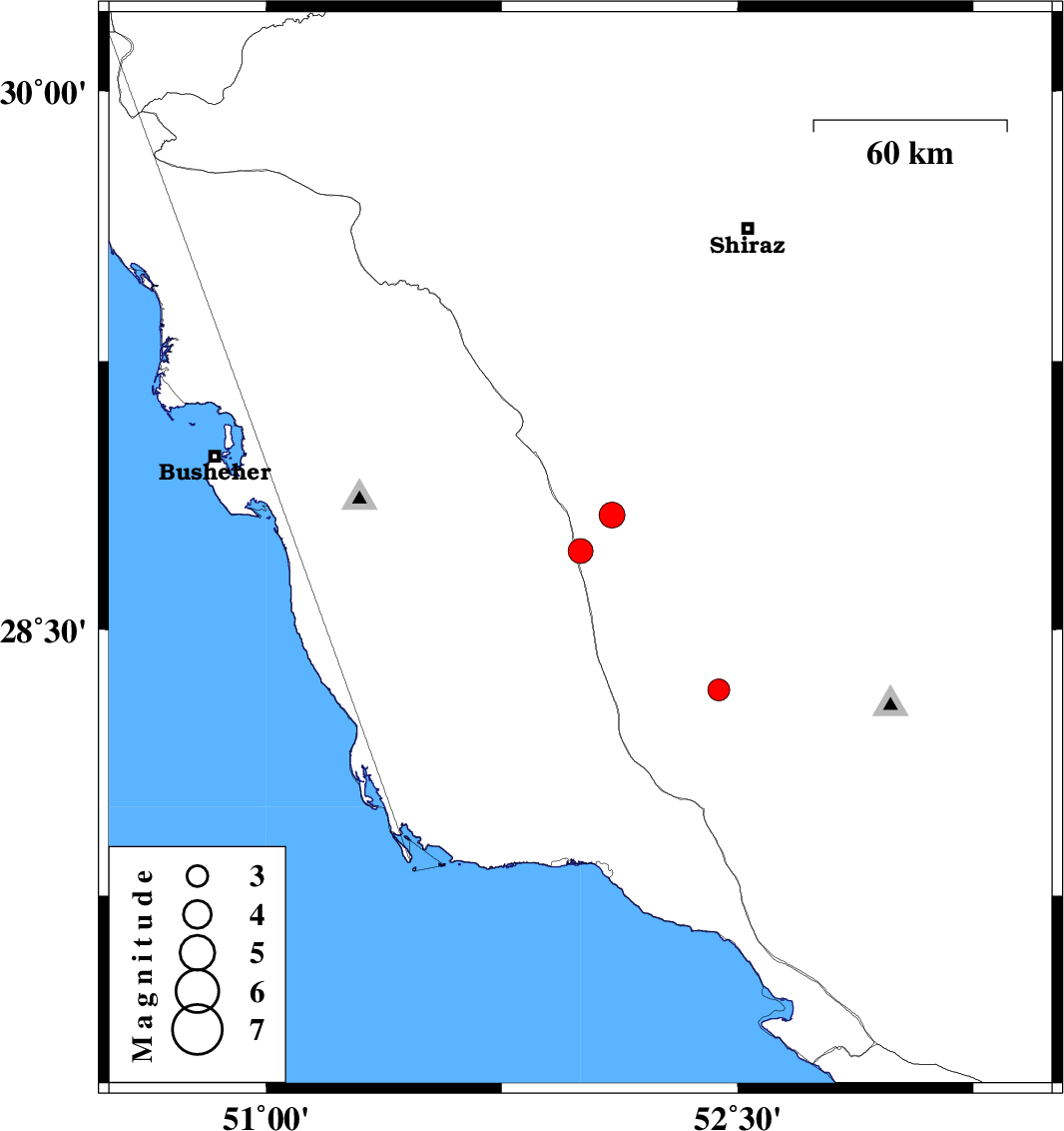 | 2007/12/04 | 13:59:16.9 | 17:29:16.9 | 28.33 | 52.44 | 14 | ML:3.1 | 56 km North-East of Jam, Bushehr Province |