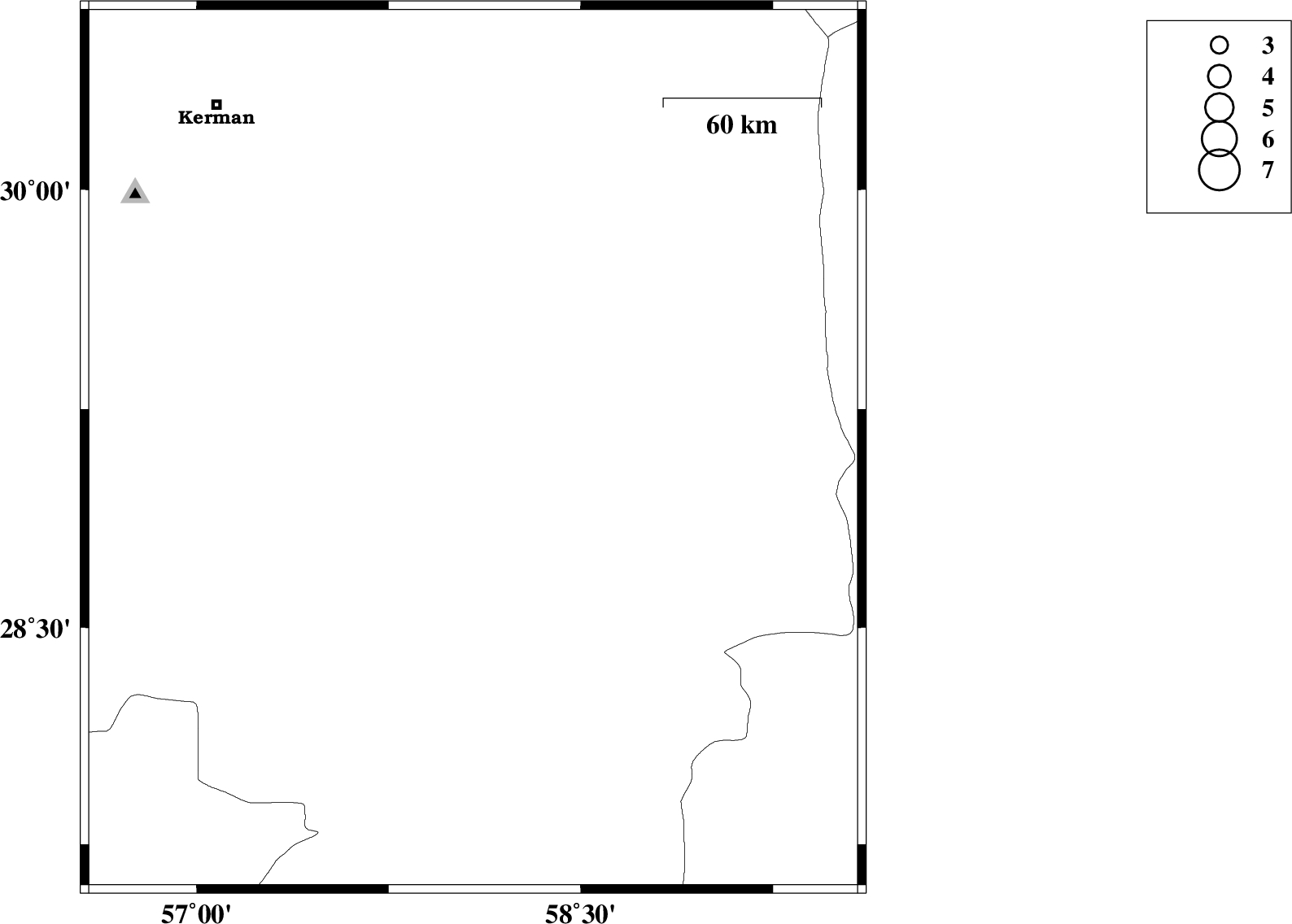 | 2007/12/25 | 15:34:52.9 | 19:04:52.9 | 29.16 | 58.09 | 14 | ML:4 | 26 km West of Bam, Kerman Province |