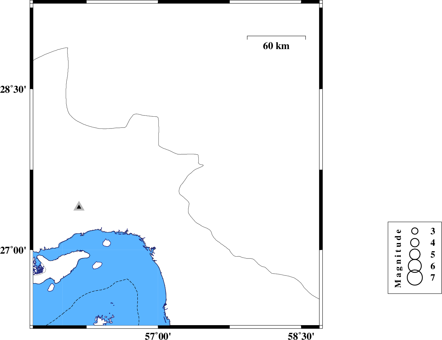 | 2008/01/07 | 00:23:30.2 | 03:53:30.2 | 27.79 | 57.19 | 40 | ML:3.6 | 41 km North of Dehbarez, Hormozgan Province | ||