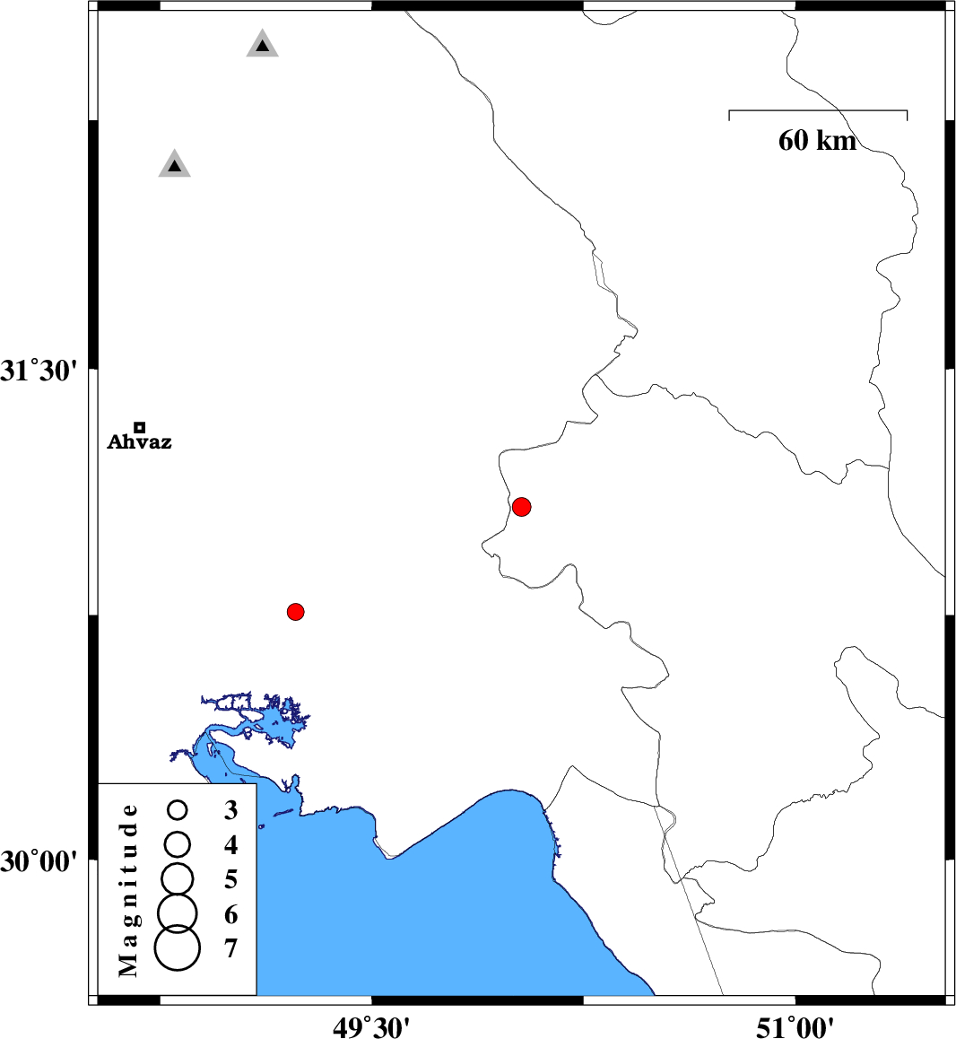 | 2008/01/16 | 00:10:08.1 | 03:40:08.1 | 31.08 | 50.03 | 41 | ML:2.9 | 45 km South-East of Ramhormoz, Khoozestan Province | ||