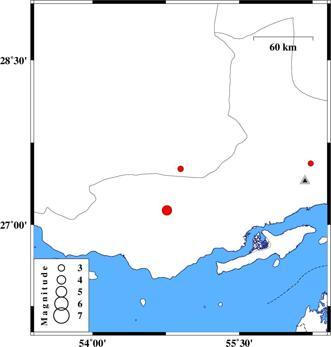 | 2008/01/18 | 11:17:51.8 | 14:47:51.8 | 27.13 | 54.76 | 30 | ML:4.5 | 39 km East of Bastak, Hormozgan Province |