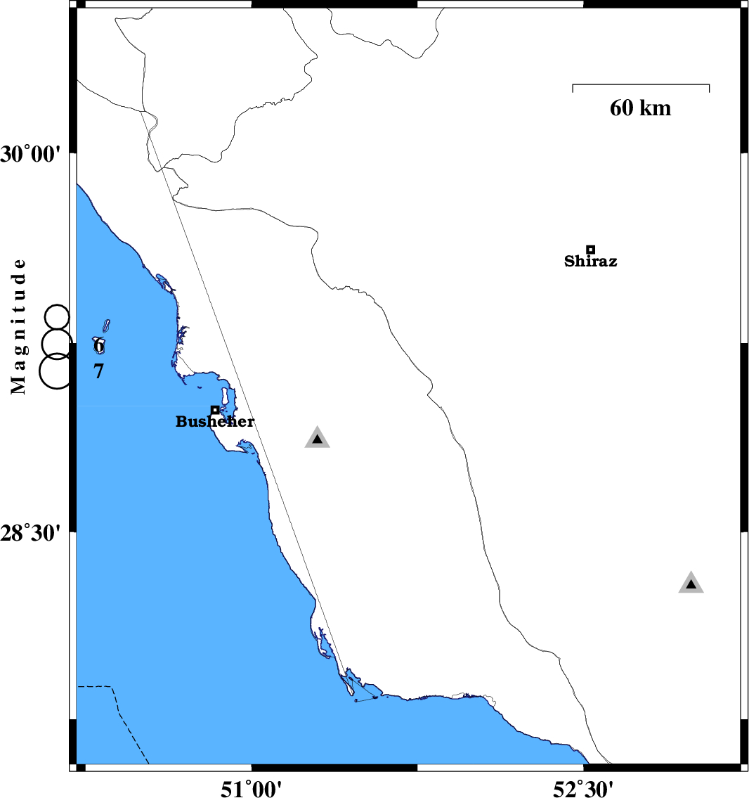 | 2008/01/23 | 11:21:25.9 | 14:51:25.9 | 28.93 | 50.7 | 45 | ML:3.8 | Persian Gulf, 14 km West of Busheher | ||