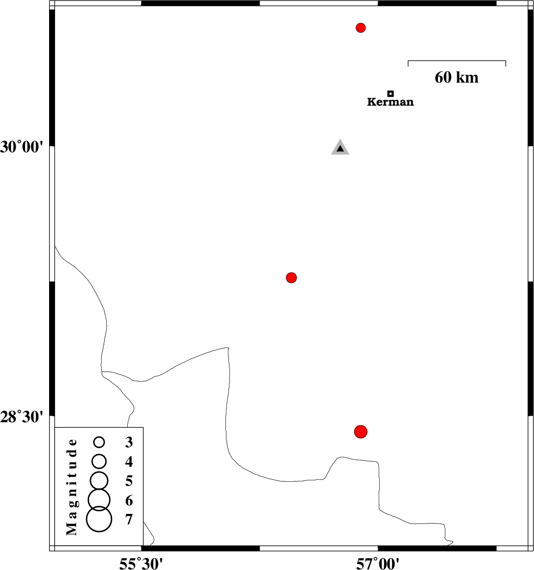 | 2008/01/26 | 00:22:30.6 | 03:52:30.6 | 30.65 | 56.89 | 6 | ML:2.7 | 35 km South-East of Zarand, Kerman Province | ||