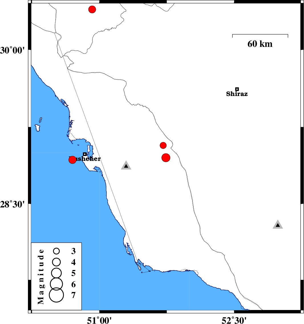 | 2008/01/23 | 11:21:25.9 | 14:51:25.9 | 28.93 | 50.7 | 45 | ML:3.8 | Persian Gulf, 14 km West of Busheher | ||