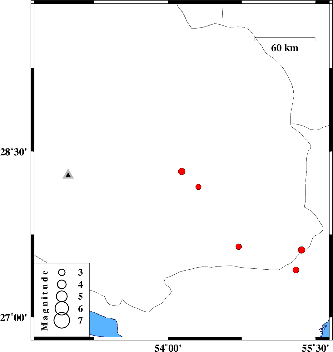 | 2008/01/23 | 18:55:13.1 | 22:25:13.1 | 27.64 | 54.72 | 18 | ML:2.7 | 37 km East of Lar, Fars Province |