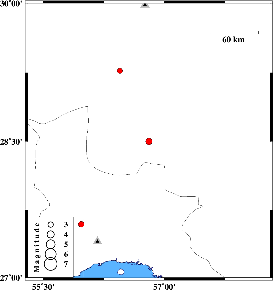 | 2008/01/30 | 03:56:21.9 | 07:26:21.9 | 27.61 | 55.36 | 14 | ML:3.1 | 93 km South-West of Hajiabad, Hormozgan Province | ||
