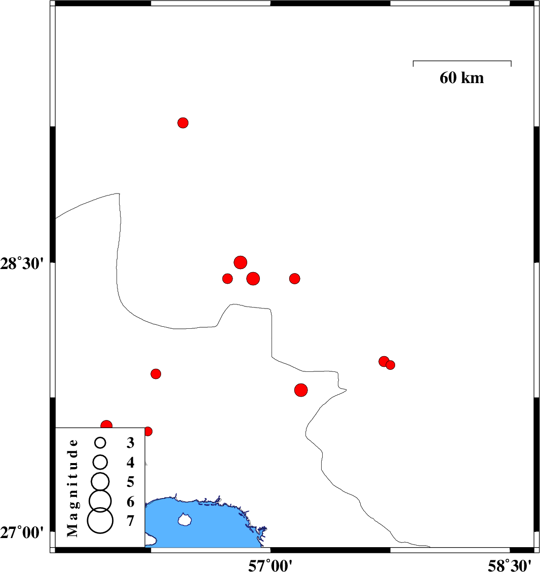 |  | 2008/01/07 | 00:23:30.2 | 03:53:30.2 | 27.79 | 57.19 | 40 | ML:3.6 | 41 km North of Dehbarez, Hormozgan Province |  |