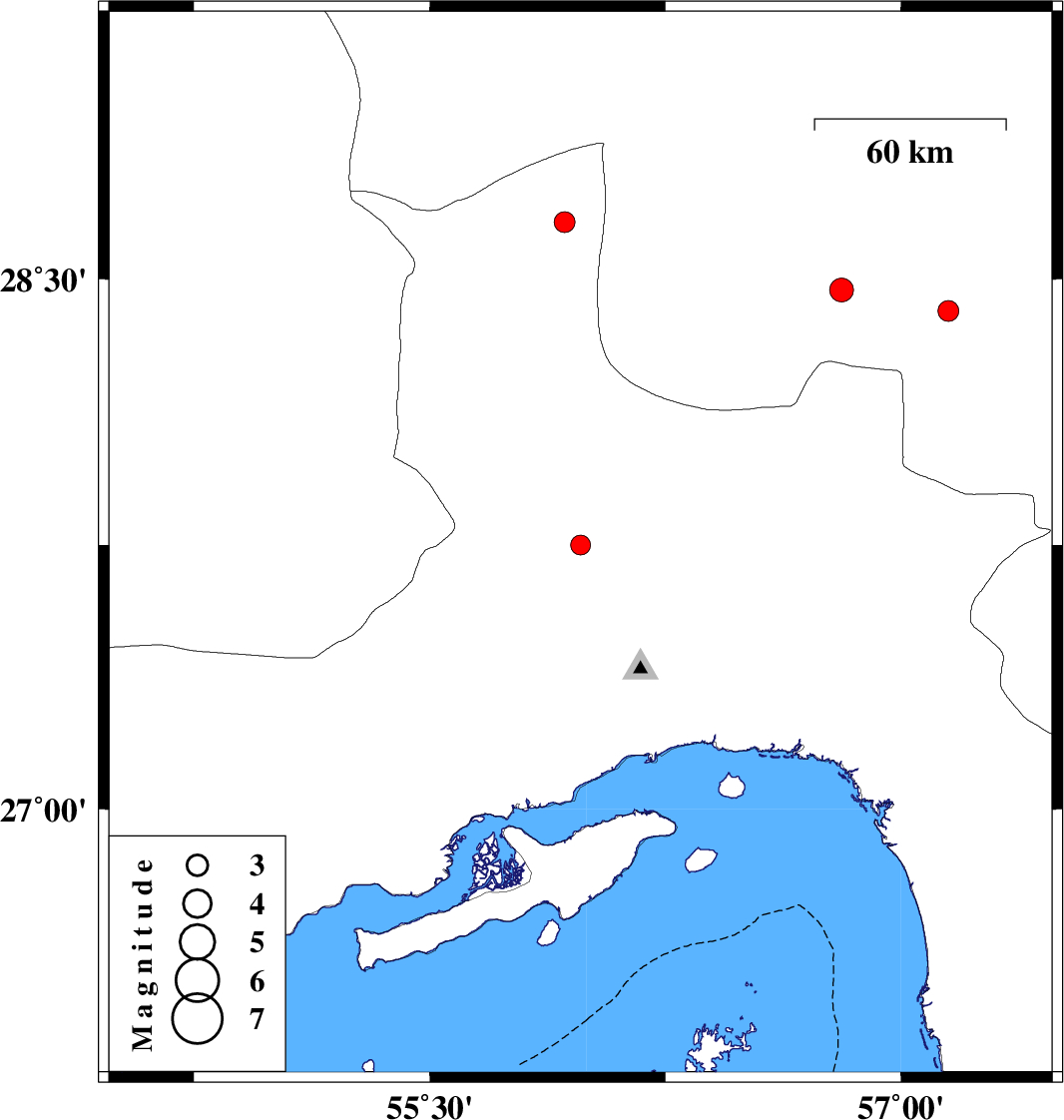 | 2008/02/04 | 19:34:55.4 | 23:04:55.4 | 28.66 | 55.93 | 15 | ML:2.9 | 39 km North of Hajiabad, Hormozgan Province | ||