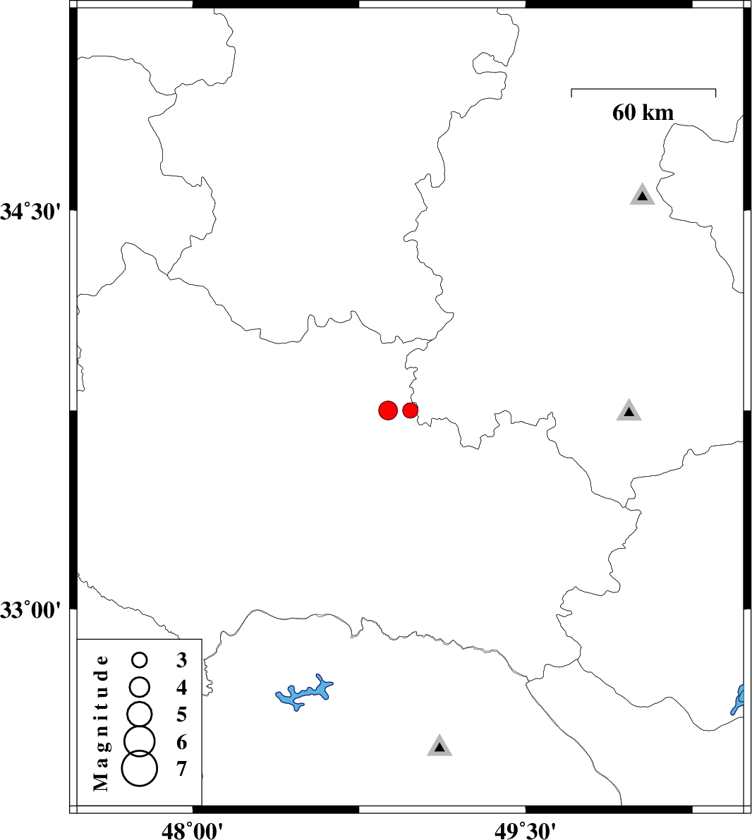 | 2008/02/20 | 01:13:41.6 | 04:43:41.6 | 33.75 | 48.88 | 17 | ML:3.8 | 19 km South-East of Borujerd, Lorestan Province |