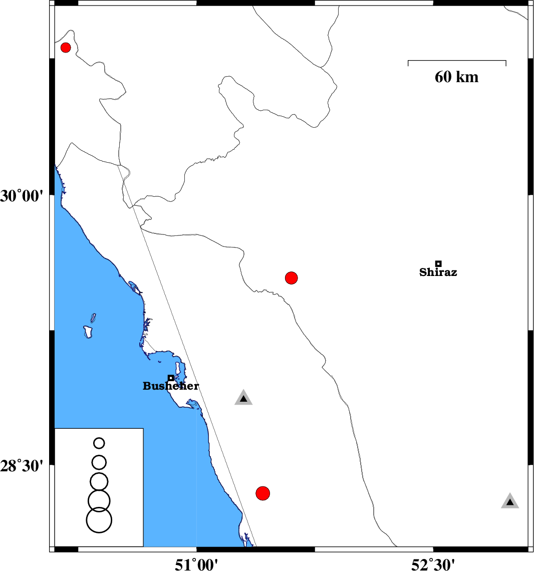 | 2008/02/25 | 20:17:57.5 | 23:47:57.5 | 28.34 | 51.42 | 18 | ML:4 | 34 km South of Khormog, Bushehr Province | ||
