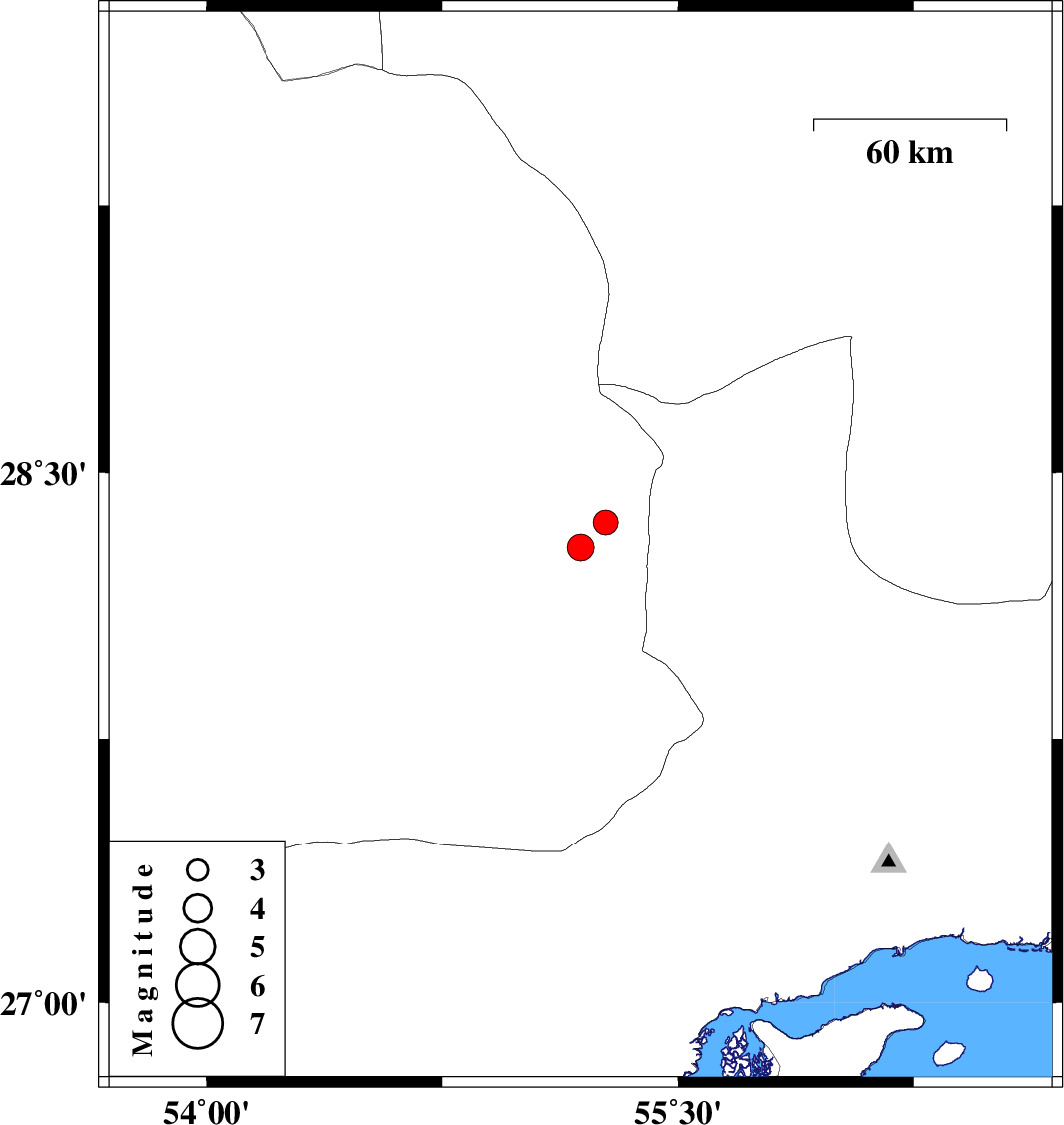 | 2008/02/28 | 08:46:58.7 | 12:16:58.7 | 28.36 | 55.27 | 15 | ML:3.5 | 62 km West of Hajiabad, Hormozgan Province |