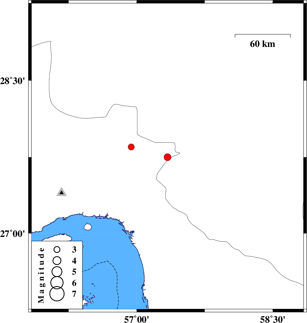 2008/03/11 | 14:03:46.4 | 17:33:46.4 | 27.75 | 57.34 | 38 | ML:3.5 | 37 km North-East of Dehbarez, Hormozgan Province | ||