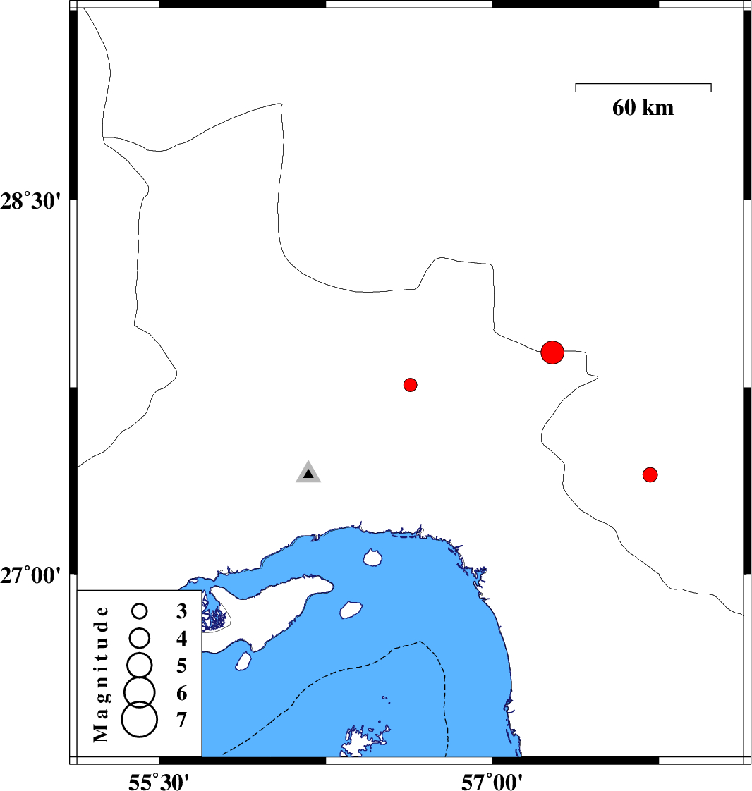 2008/04/06 | 18:42:54.2 | 23:12:54.2 | 27.76 | 56.63 | 14 | ML:2.7 | 70 km North-West of Dehbarez, Hormozgan Province | ||