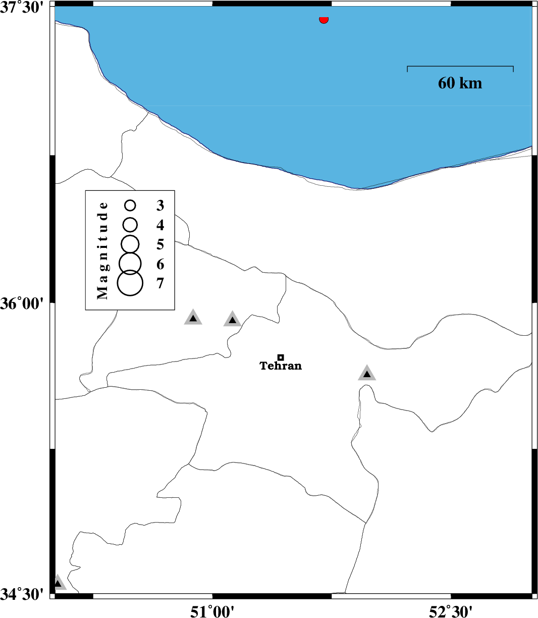 2008/04/14 | 06:45:34.6 | 11:15:34.6 | 36 | 51.51 | 0 | ML:2.5 | 22 km North of Tajrish, Tehran Province | ||