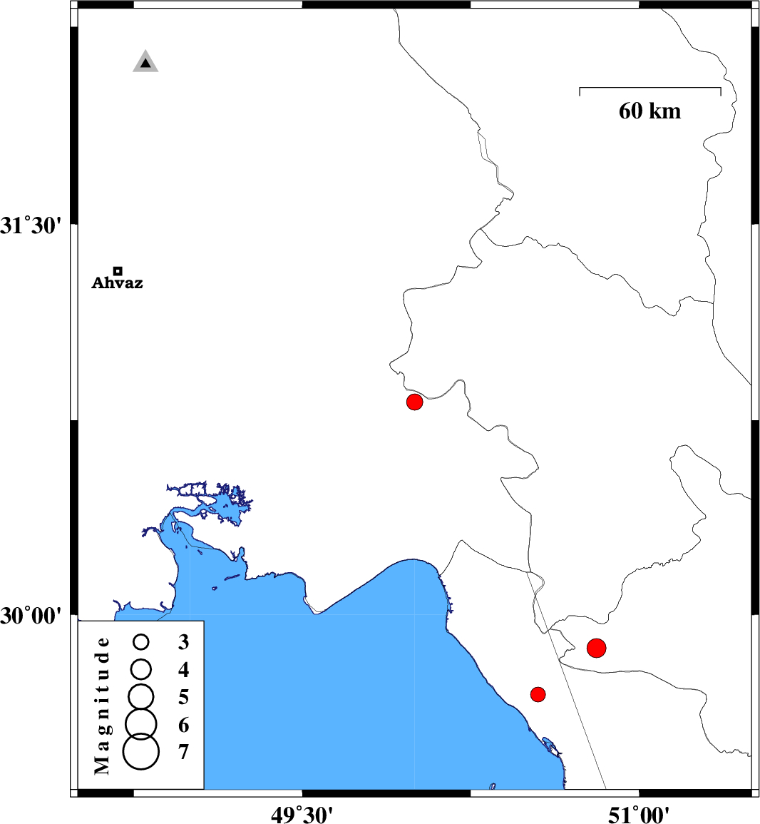 2008/05/02 | 22:28:22.2 | 02:58:22.2 | 30.82 | 50 | 44 | ML:3.3 | 28 km East of Omidiyeh, Khoozestan Province | ||