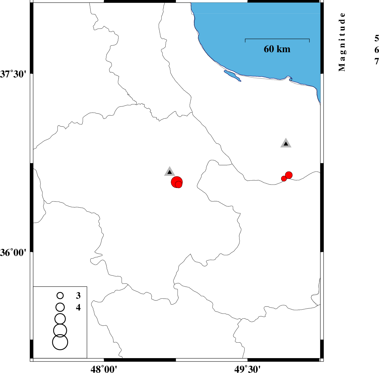 2008/05/27 | 06:18:04.1 | 10:48:04.1 | 36.59 | 48.76 | 14 | ML:5.4 | 26 km East of Zanjan, Zanjan Province | ||