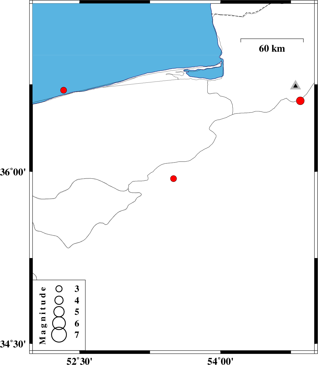 2008/06/09 | 13:38:22.7 | 18:08:22.7 | 36.7 | 52.33 | 28 | ML:2.9 | Caspian Sea, 8 km Mahmud Abad | ||