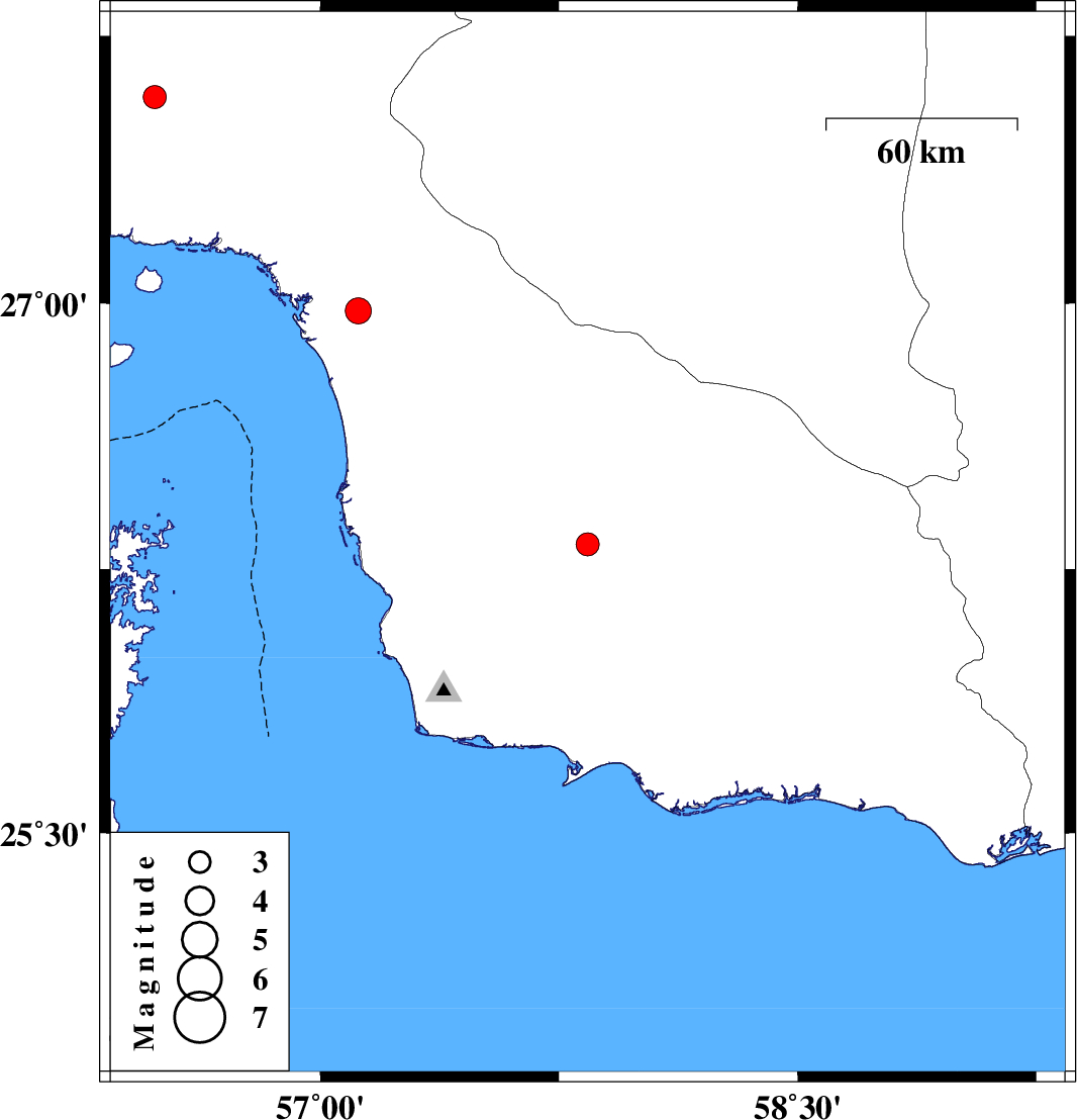 2008/06/23 | 22:16:14.6 | 02:46:14.6 | 27.58 | 56.48 | 14 | ML:3.3 | 48 km North-East of Bandar-e abbas, Hormozgan Province | ||