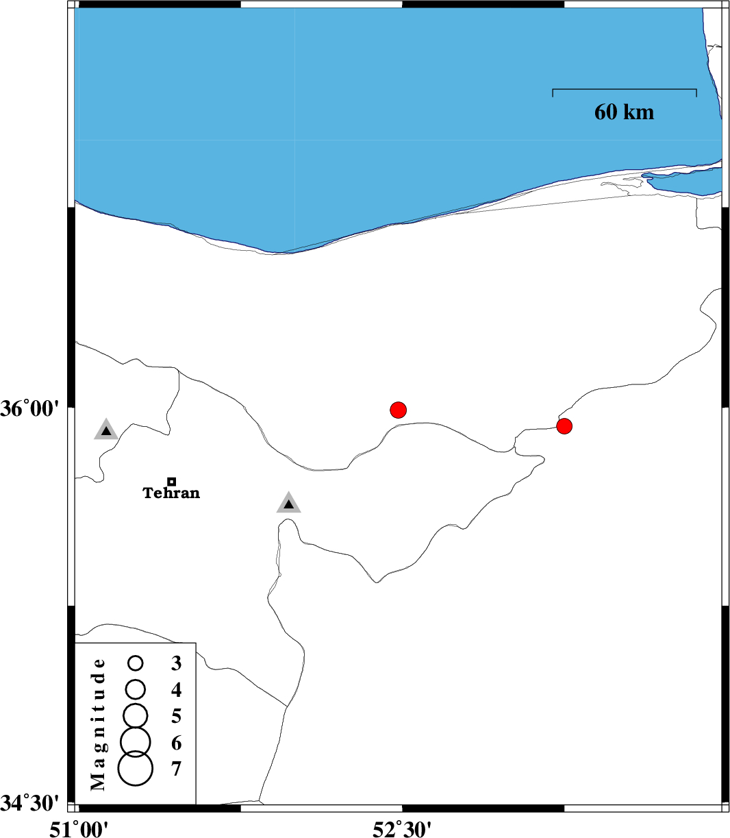 2008/06/29 | 00:38:27.1 | 05:08:27.1 | 35.99 | 52.48 | 14 | ML:3.4 | 37 km North-West of Firuzkuh, Tehran Province | ||
