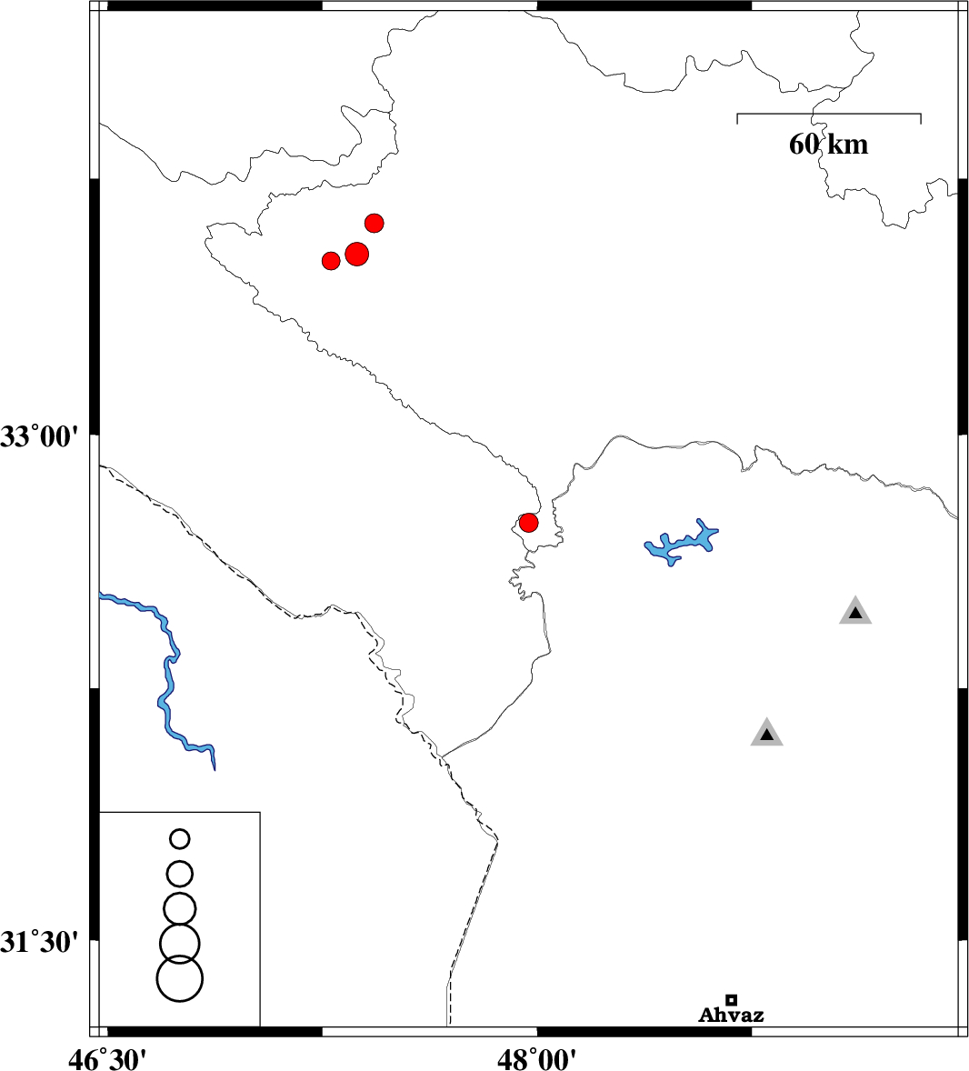 2008/07/17 | 06:39:55.6 | 11:09:55.6 | 33.51 | 47.28 | 18 | ML:2.8 | 30 km West of Kuhdasht, Lorestan Province | ||