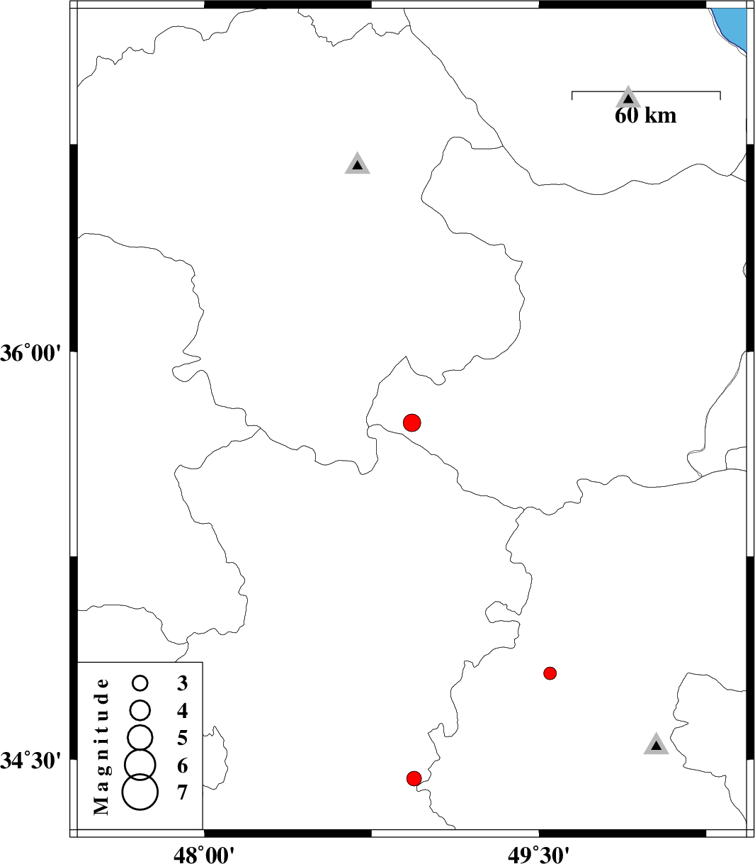 2008/07/01 | 18:33:45.7 | 23:03:45.7 | 34.43 | 48.94 | 14 | ML:2.9 | 18 km North-East of Malayer, Hamedan Province | ||