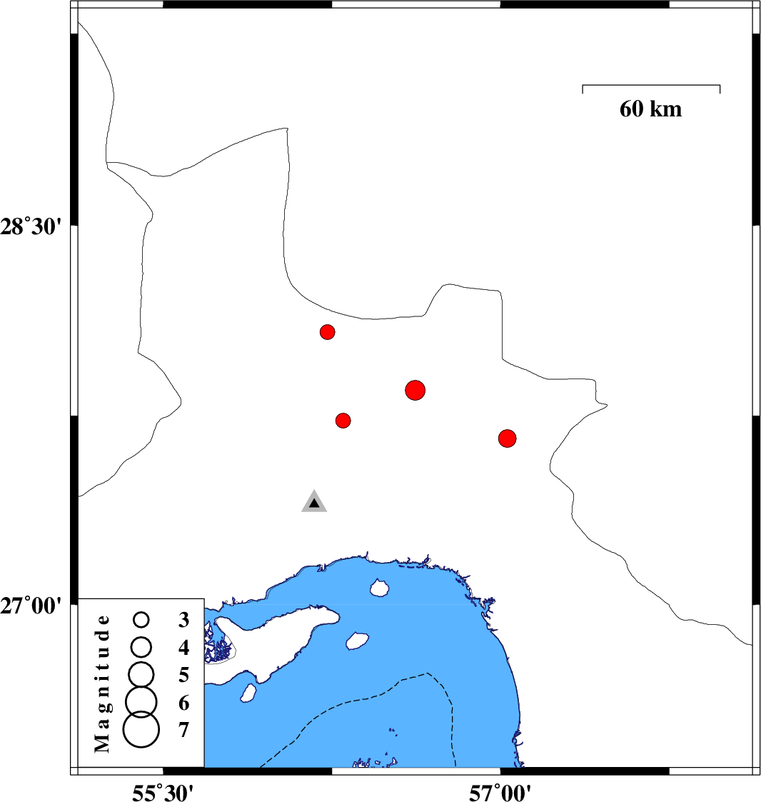 2008/07/12 | 04:27:10.8 | 08:57:10.8 | 27.73 | 56.3 | 14 | ML:3 | 60 km North of Bandar-e abbas, Hormozgan Province |