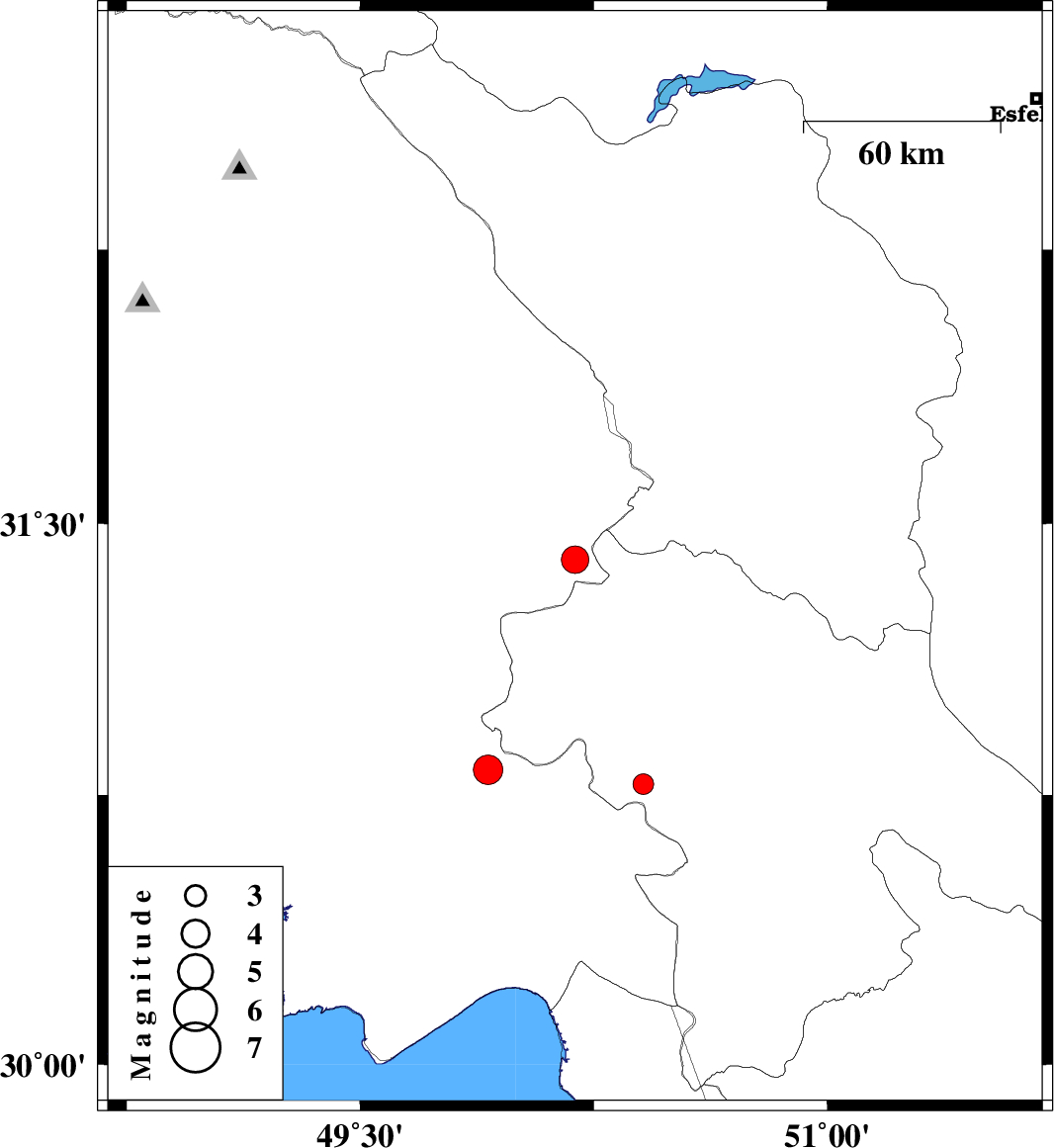 2008/08/18 | 02:42:35.2 | 07:12:35.2 | 30.78 | 50.41 | 14 | ML:3 | 14 km West of Dehdasht, Kohkiluieh va boyerahmad Province |