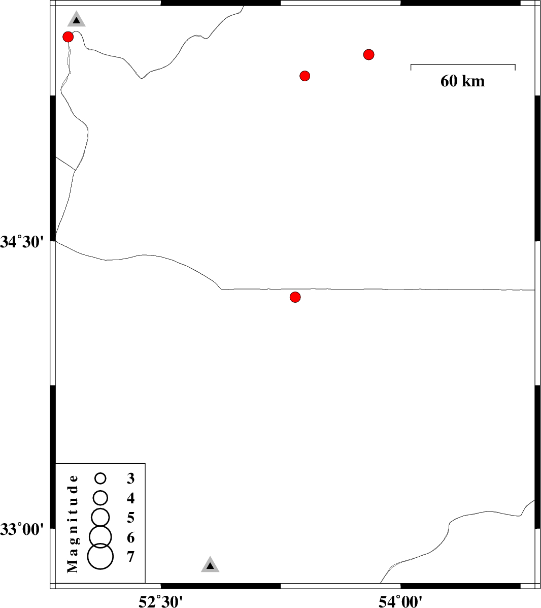 2008/08/24 | 07:49:57.5 | 12:19:57.5 | 34.21 | 53.34 | 14 | ML:3 | 128 km North-East of Ardestan, Esfahan Province | ||