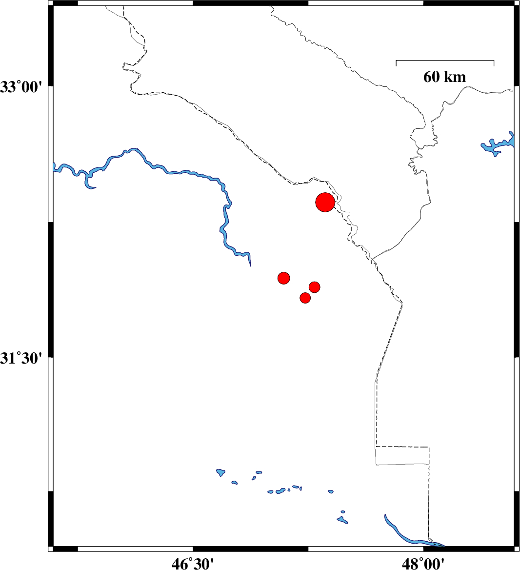 2008/08/27 | 23:16:17.9 | 03:46:17.9 | 31.83 | 47.23 | 37 | ML:3.1 | 95 km North-West of Susangerd, Khoozestan Province | ||