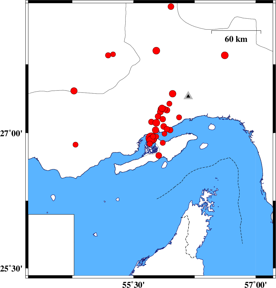 2008/09/10 11:00:35.1 15:30:35.1 26.9455.727 Mb:6.2 Persian Gulf, 54 km West of Qeshm