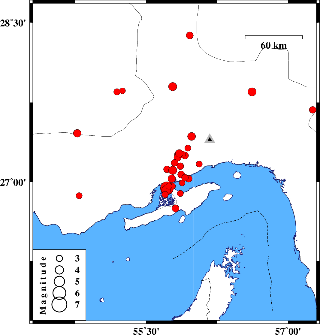 2008/09/10 19:03:15.5 23:33:15.5 27.0455.913 ML:3.3 36 km West of Qeshm, Hormozgan Province