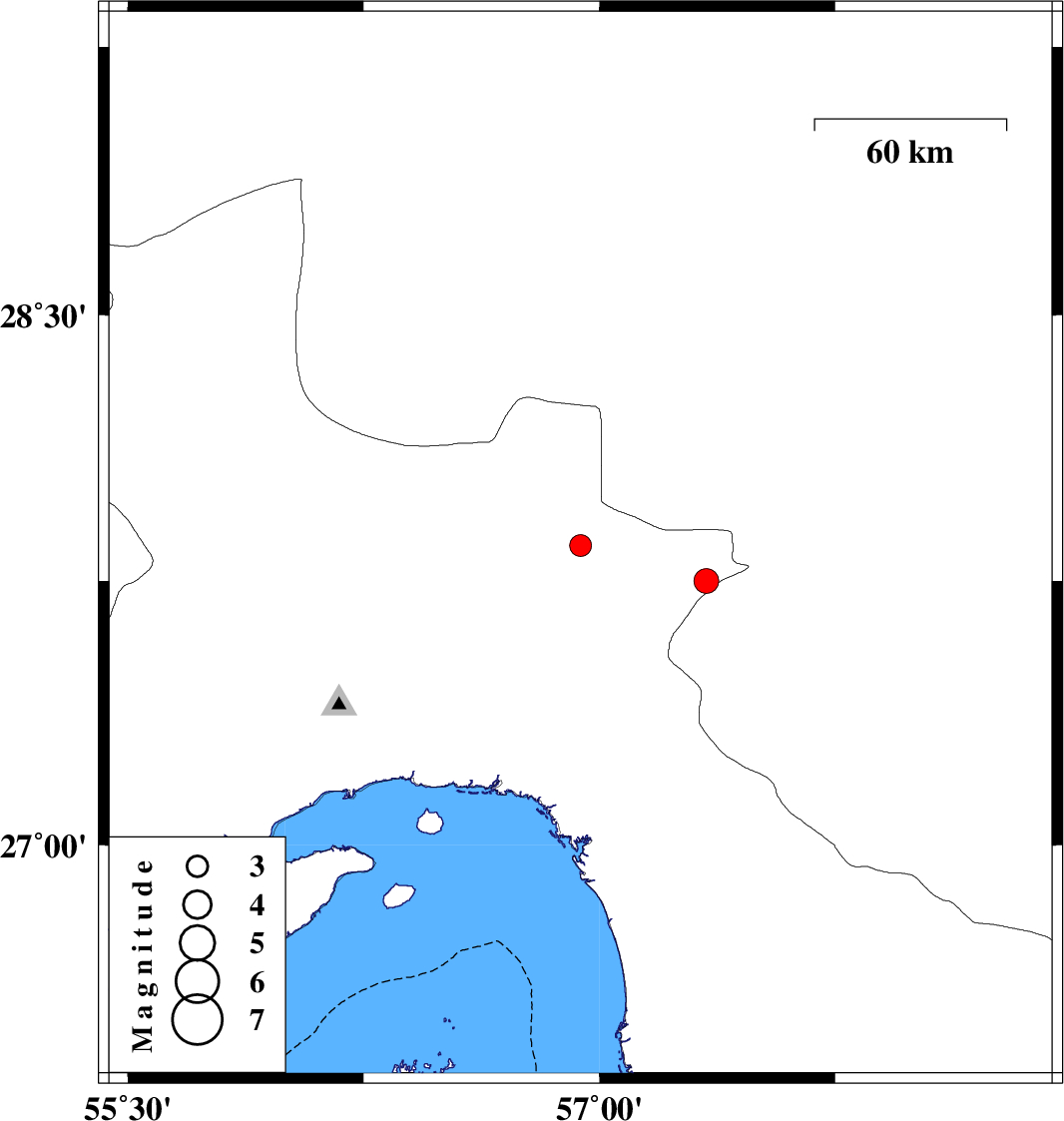 2008/03/11 | 14:03:46.4 | 17:33:46.4 | 27.75 | 57.34 | 38 | ML:3.5 | 37 km North-East of Dehbarez, Hormozgan Province | ||