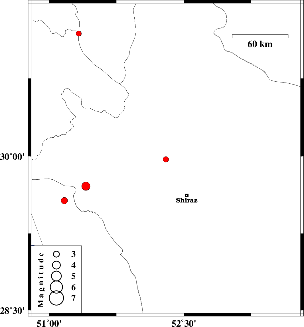 2008/09/05 | 03:11:42.5 | 07:41:42.5 | 29.71 | 51.41 | 15 | ML:4.2 | 25 km West of Kazerun, Fars Province |