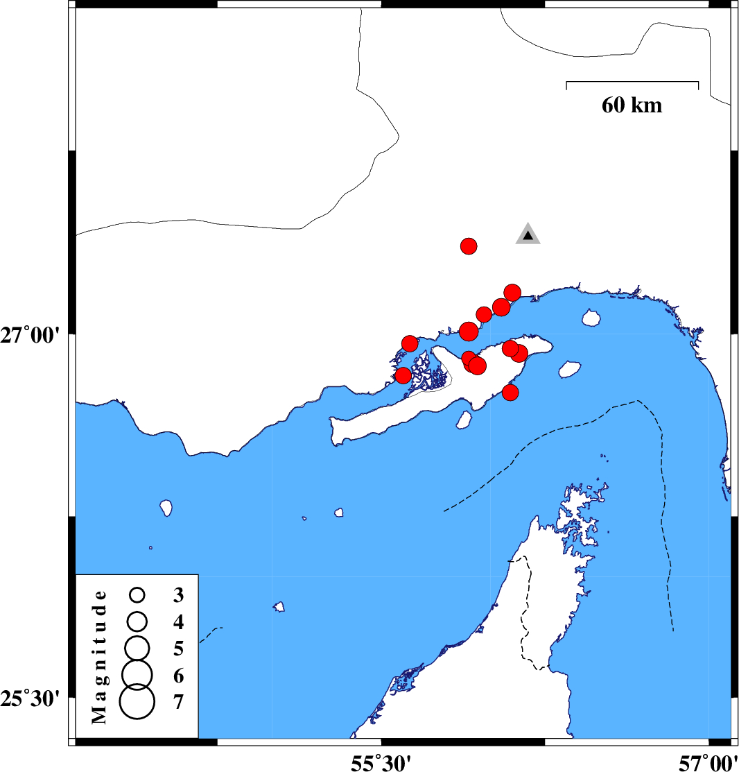2008/09/29 04:30:20.5 08:00:20.5 26.955.97 ML:2.9 Persian Gulf, 36 km West of Qeshm