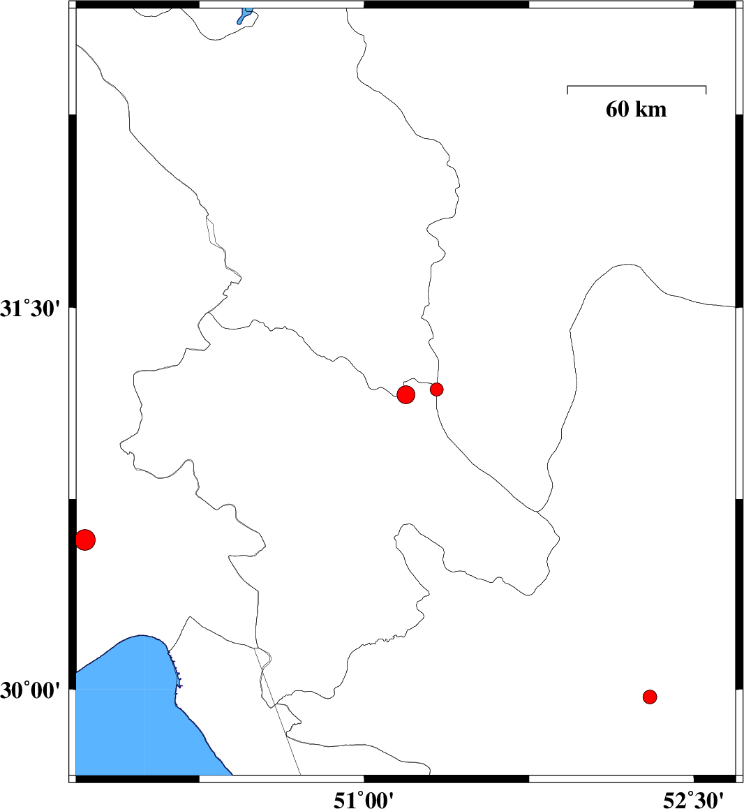 2008/09/25 | 15:32:08.1 | 19:02:08.1 | 30.59 | 49.73 | 15 | ML:4.3 | 19 km South of Omidiyeh, Khoozestan Province | ||