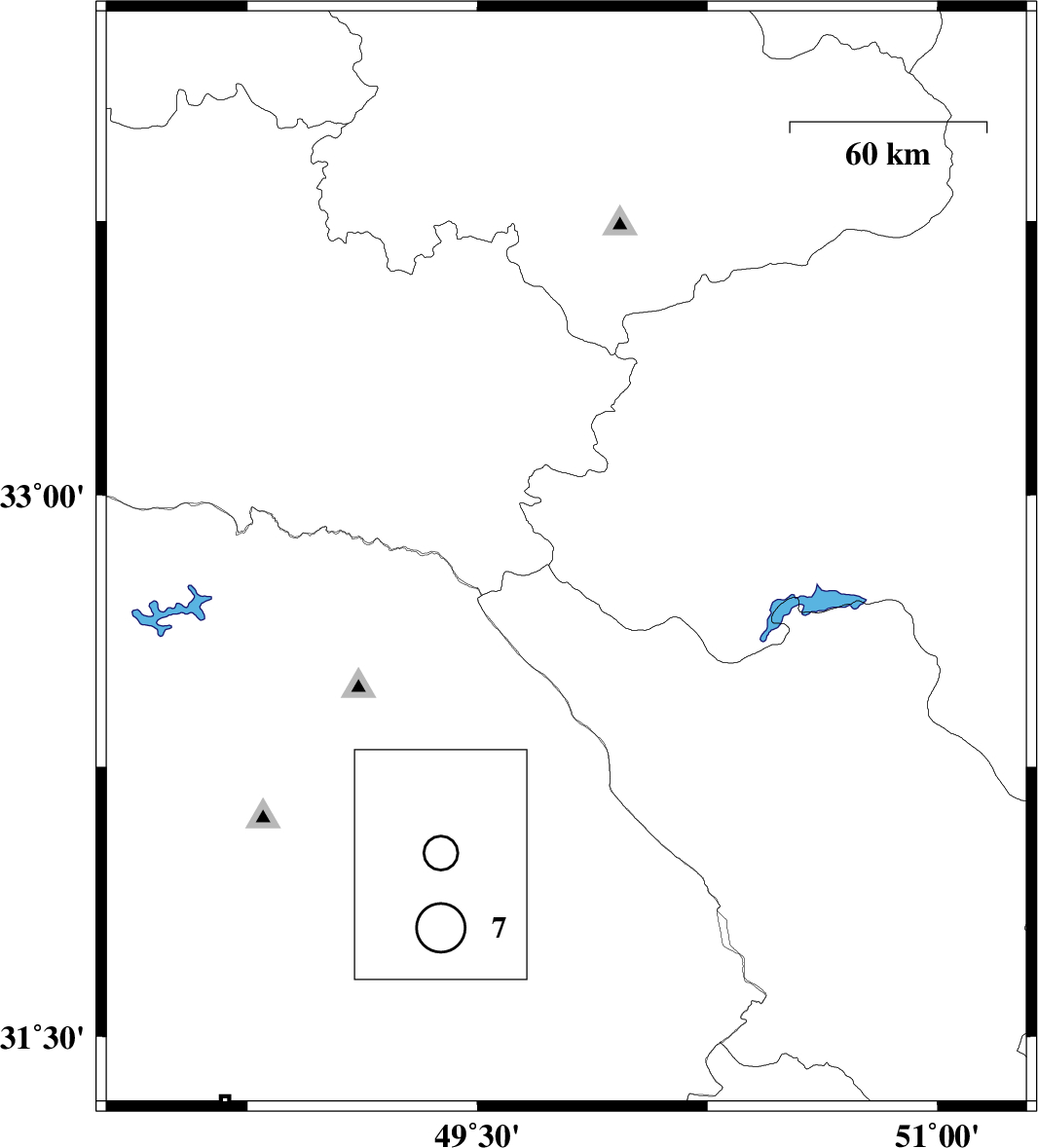 2008/10/12 | 18:11:38.0 | 21:41:38.0 | 32.82 | 49.79 | 15 | ML:2.9 | 33 km South-West of Fereydunshahr, Esfahan Province |
