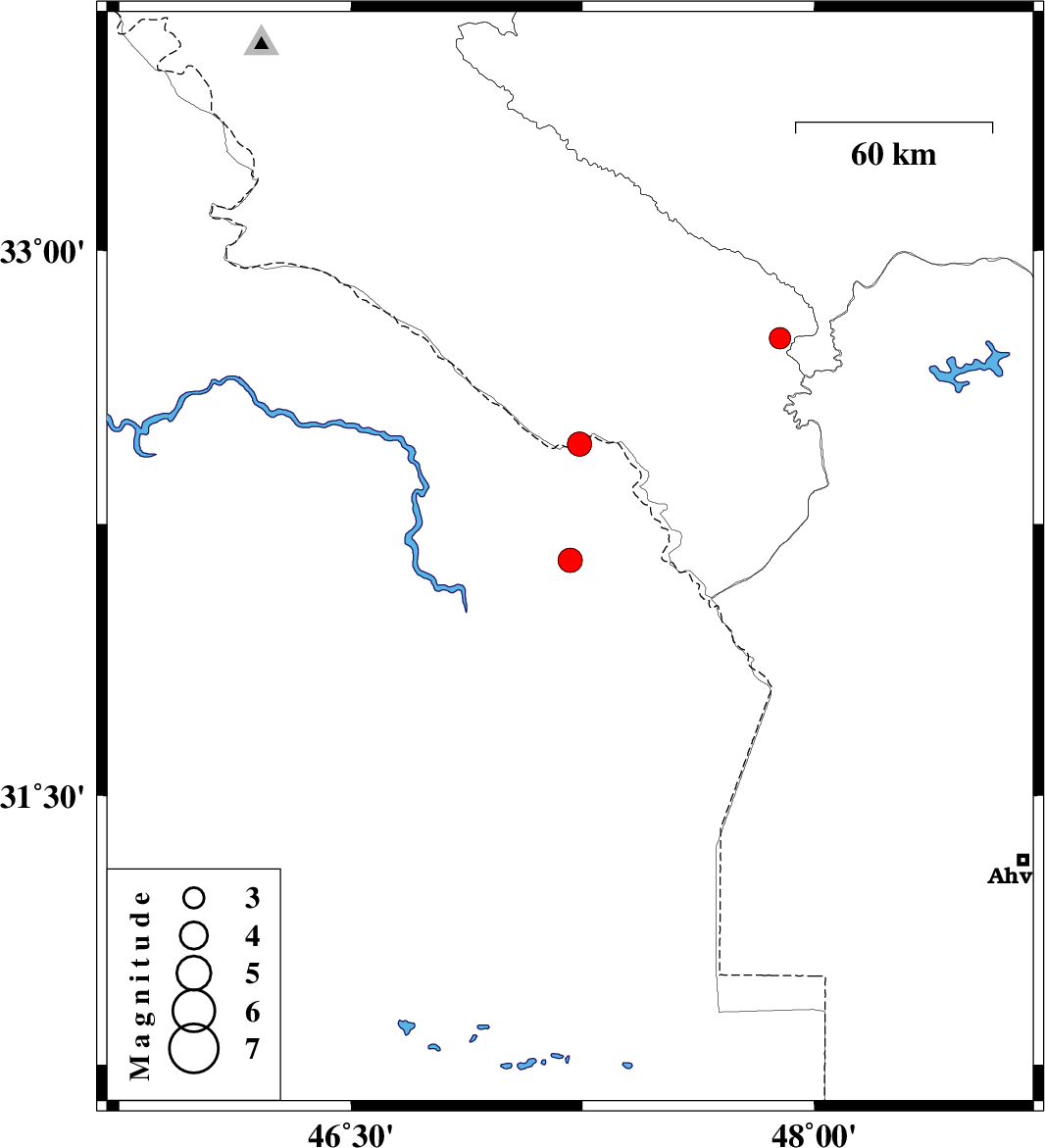 2008/11/07 | 08:39:25.2 | 12:09:25.2 | 32.76 | 47.89 | 14 | ML:3.1 | 44 km South-East of Abdanan, Ilam Province |