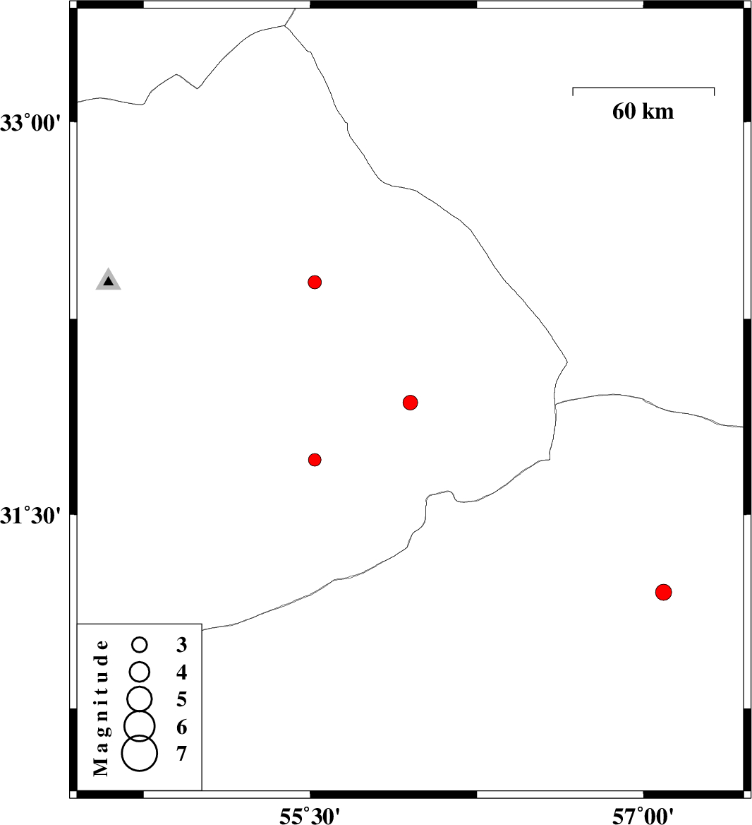 2008/11/20 | 04:14:59.2 | 07:44:59.2 | 31.93 | 55.95 | 15 | ML:3 | 63 km North-East of Bafq, Yazd Province | ||