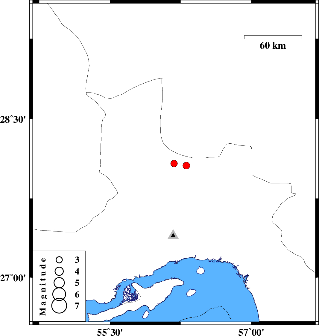 2008/11/25 | 02:34:19.7 | 06:04:19.7 | 28.08 | 56.18 | 14 | ML:3.3 | 37 km South-East of Hajiabad, Hormozgan Province |