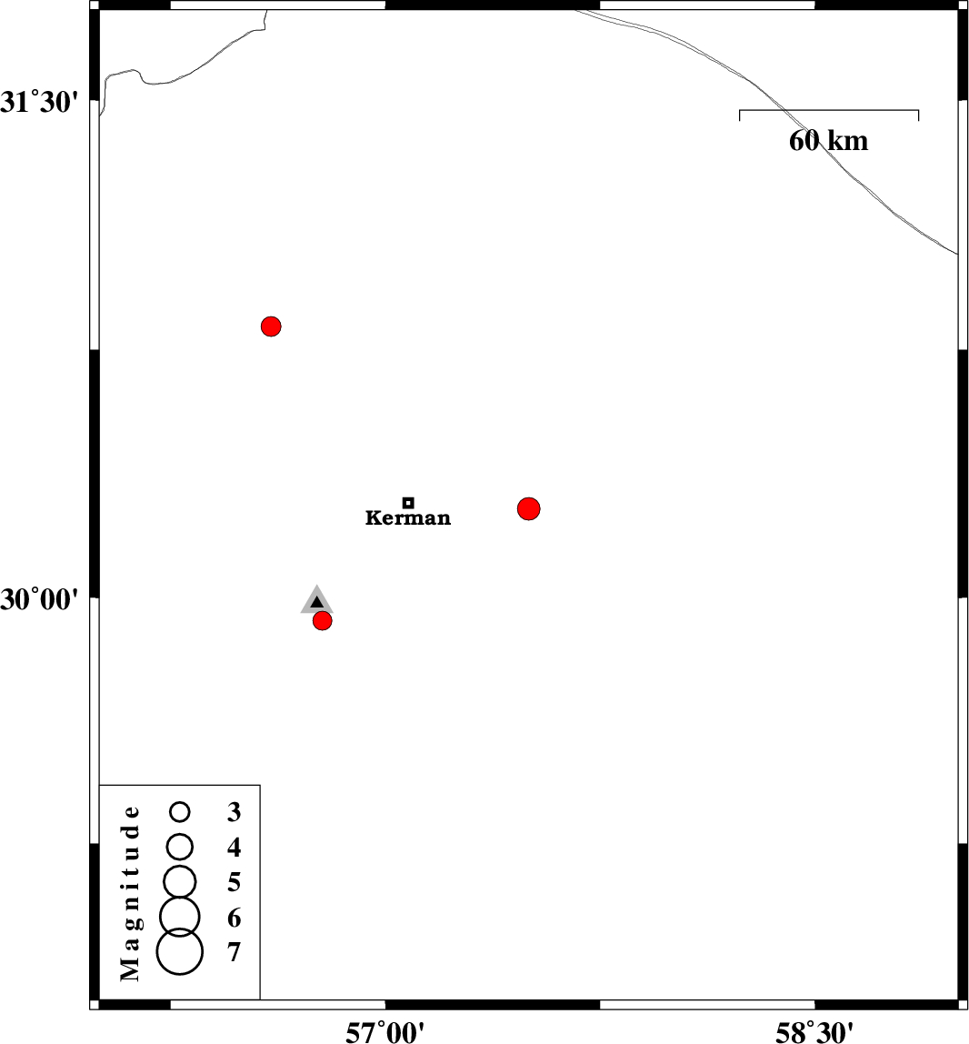 2008/11/25 | 17:30:31.2 | 21:00:31.2 | 30.27 | 57.5 | 14 | ML:3.5 | 40 km East of Kerman, Kerman Province | ||