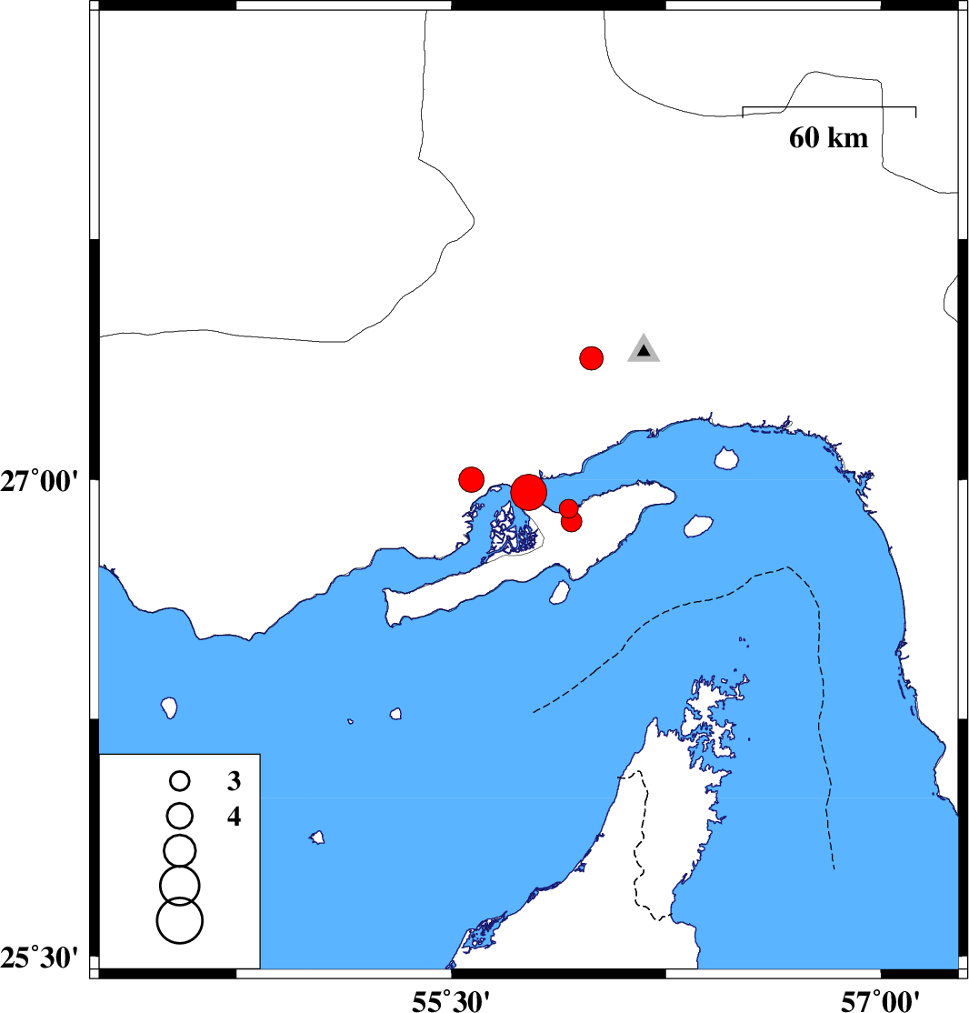 2008/11/30 13:46:15.9 17:16:15.9 2755.5718 ML:4 69 km West of Qeshm, Hormozgan Province