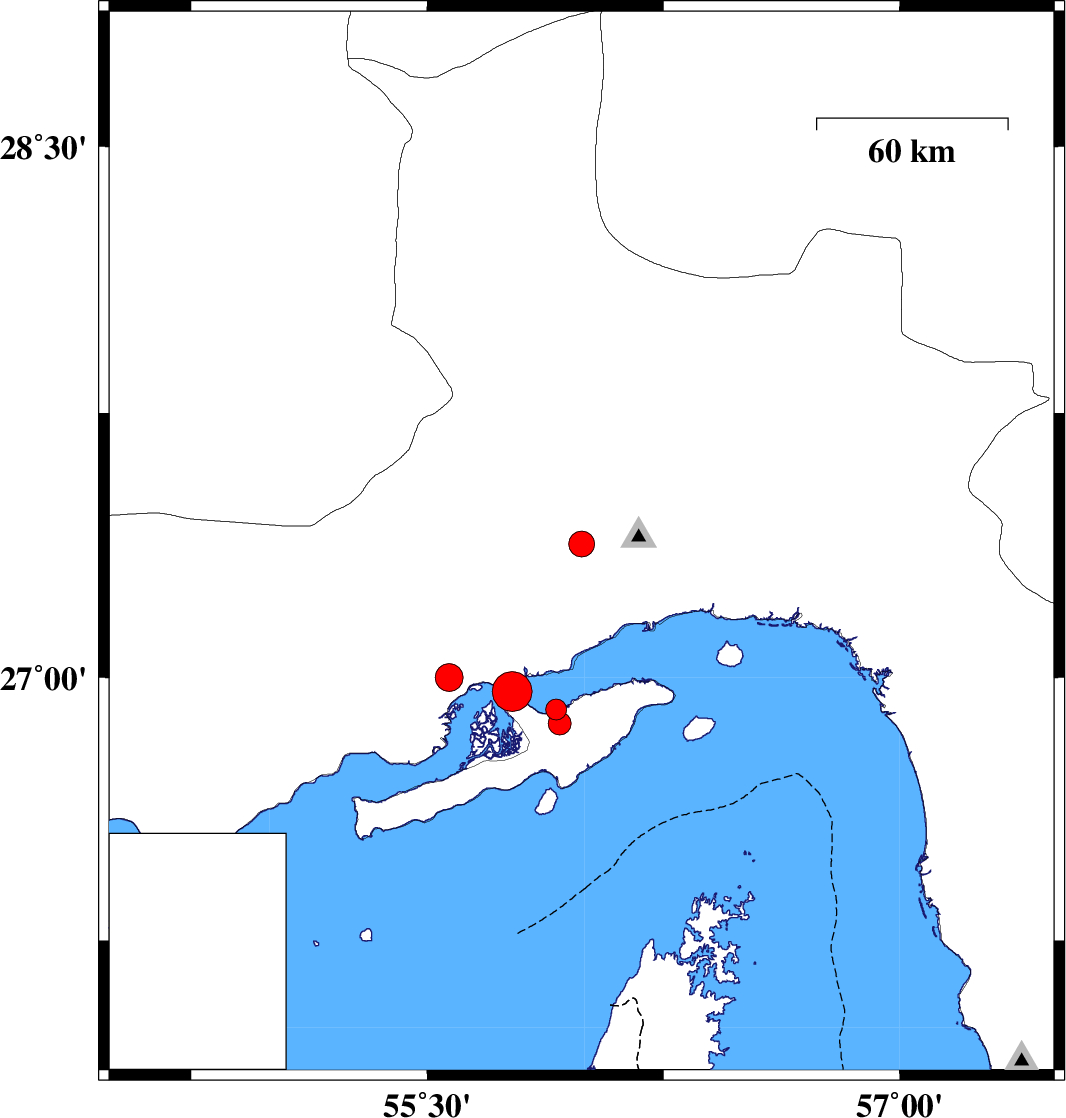 2008/11/30 13:46:15.9 17:16:15.9 2755.5718 ML:4 69 km West of Qeshm, Hormozgan Province