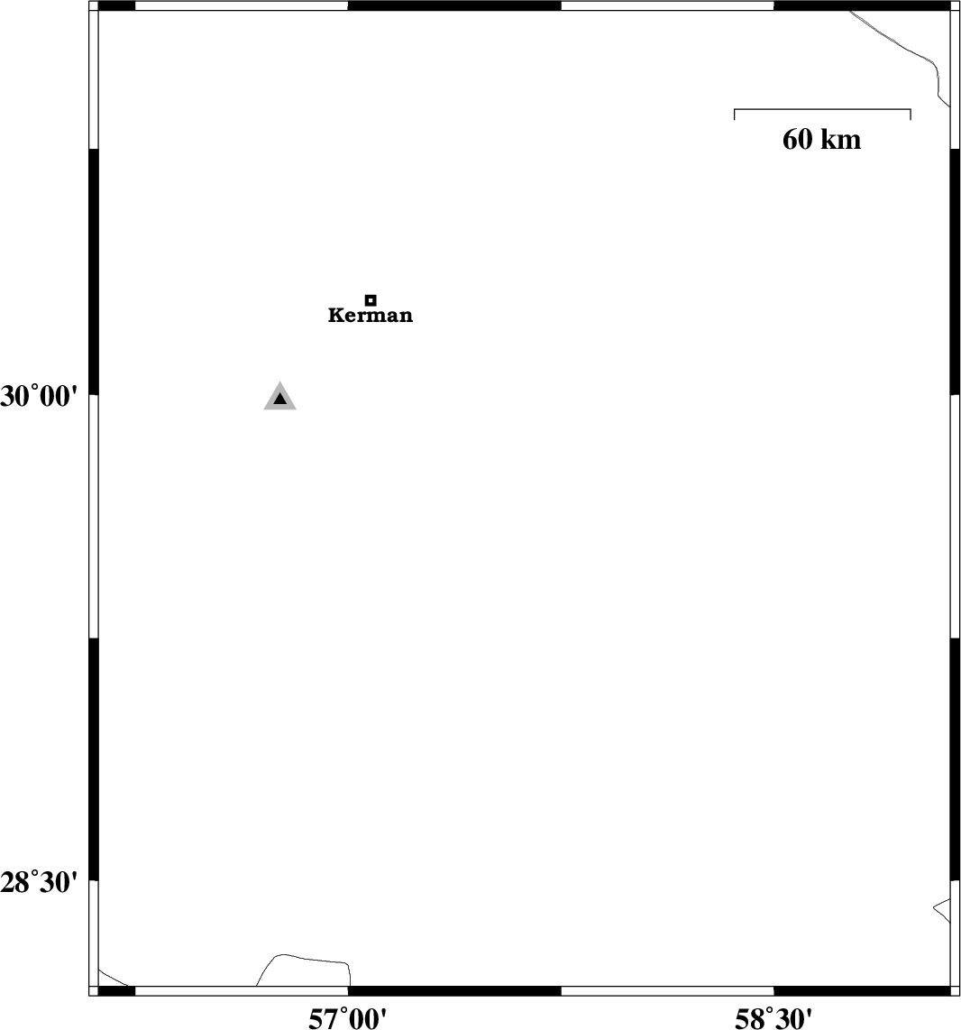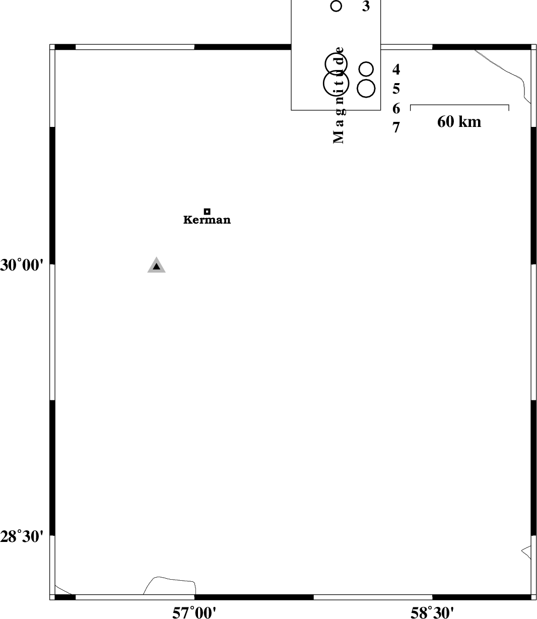 2008/12/09 | 18:50:59.9 | 22:20:59.9 | 29.67 | 57.62 | 18 | ML:2.6 | 86 km South-East of Kerman, Kerman Province | ||